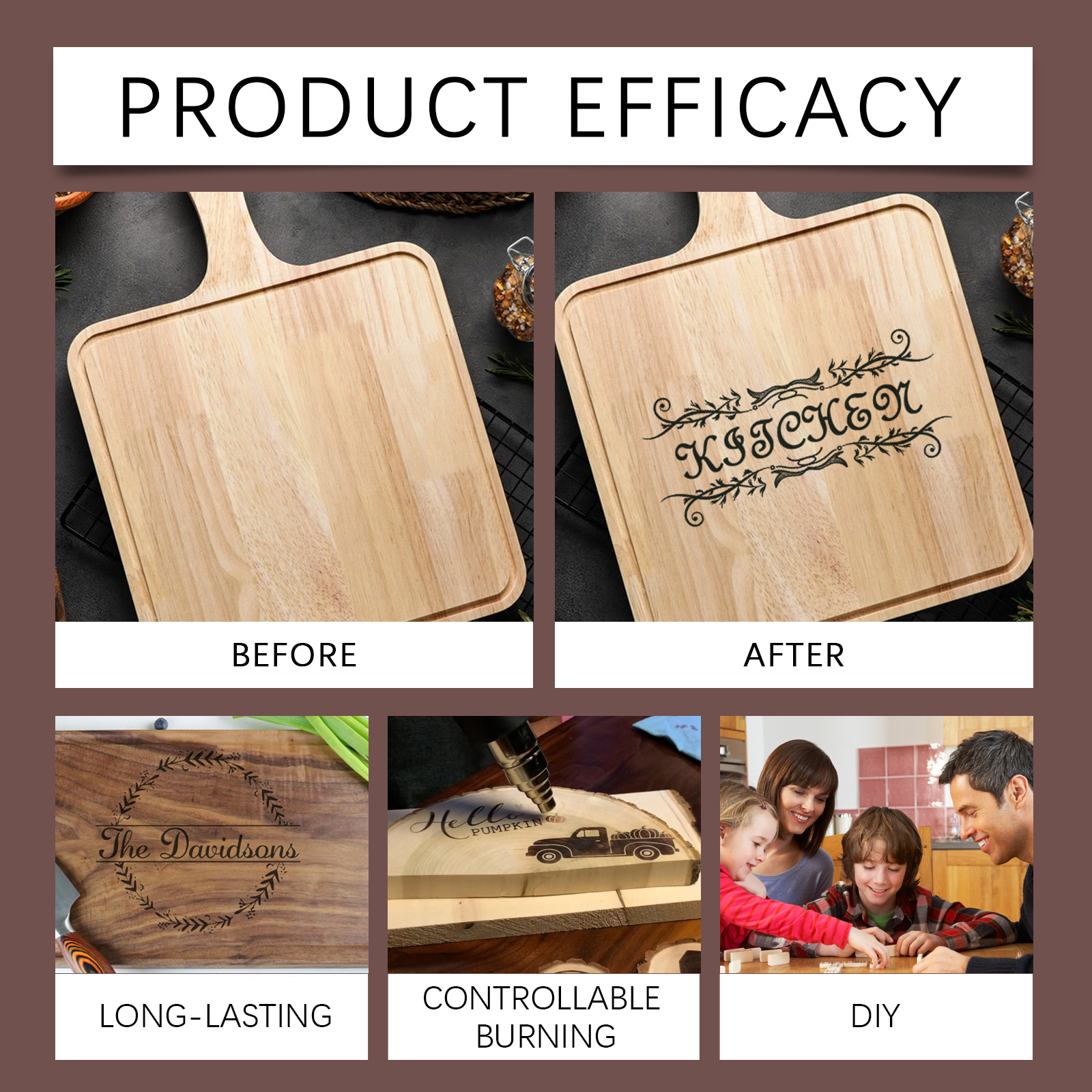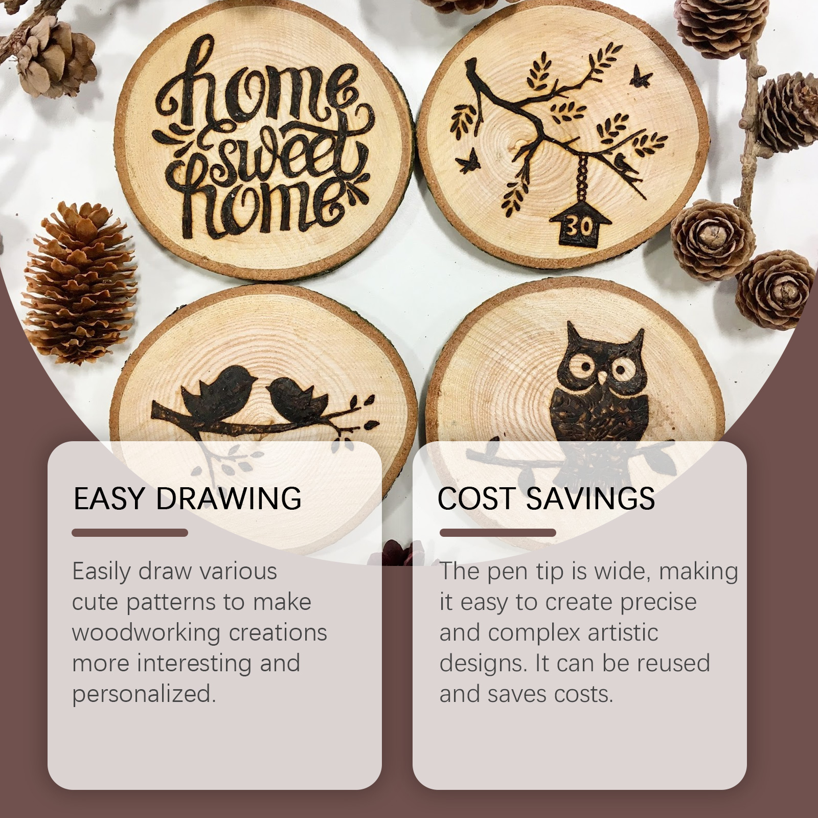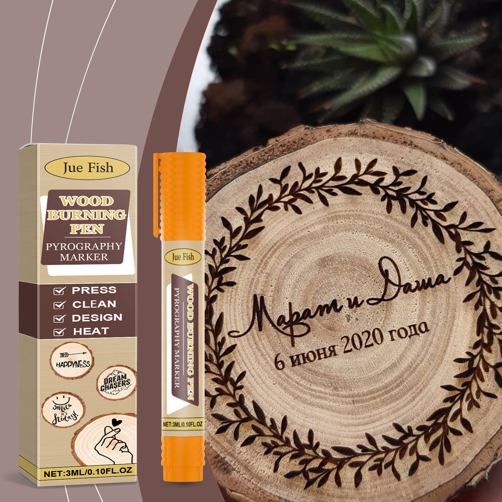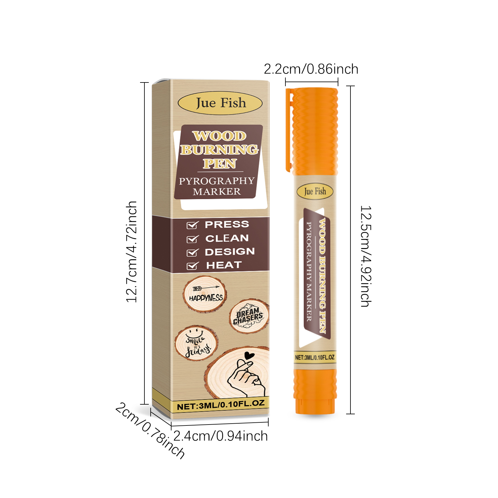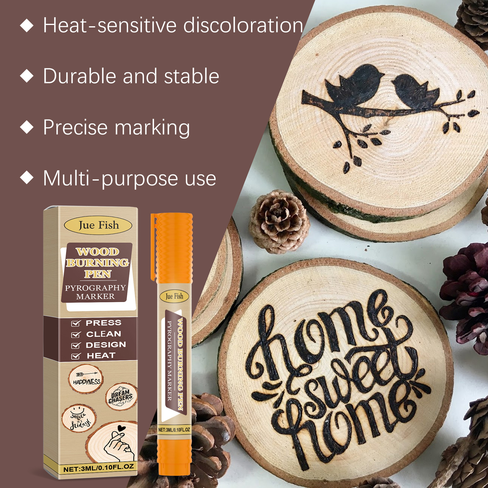我们的木材烙画标记笔含有亚麻籽油、蜜蜡、氧化铁。它可以创建精确复杂的艺术设计,可重复使用,节省成本。它的使用方法很简单:清洁木质表面,将产品摇匀然后轻按笔尖,画出自己喜欢的图案,用加热枪加热,直到达到预期的效果。并且可以轻松绘制各种可爱的图案,让木工创作更加有趣和个性化。