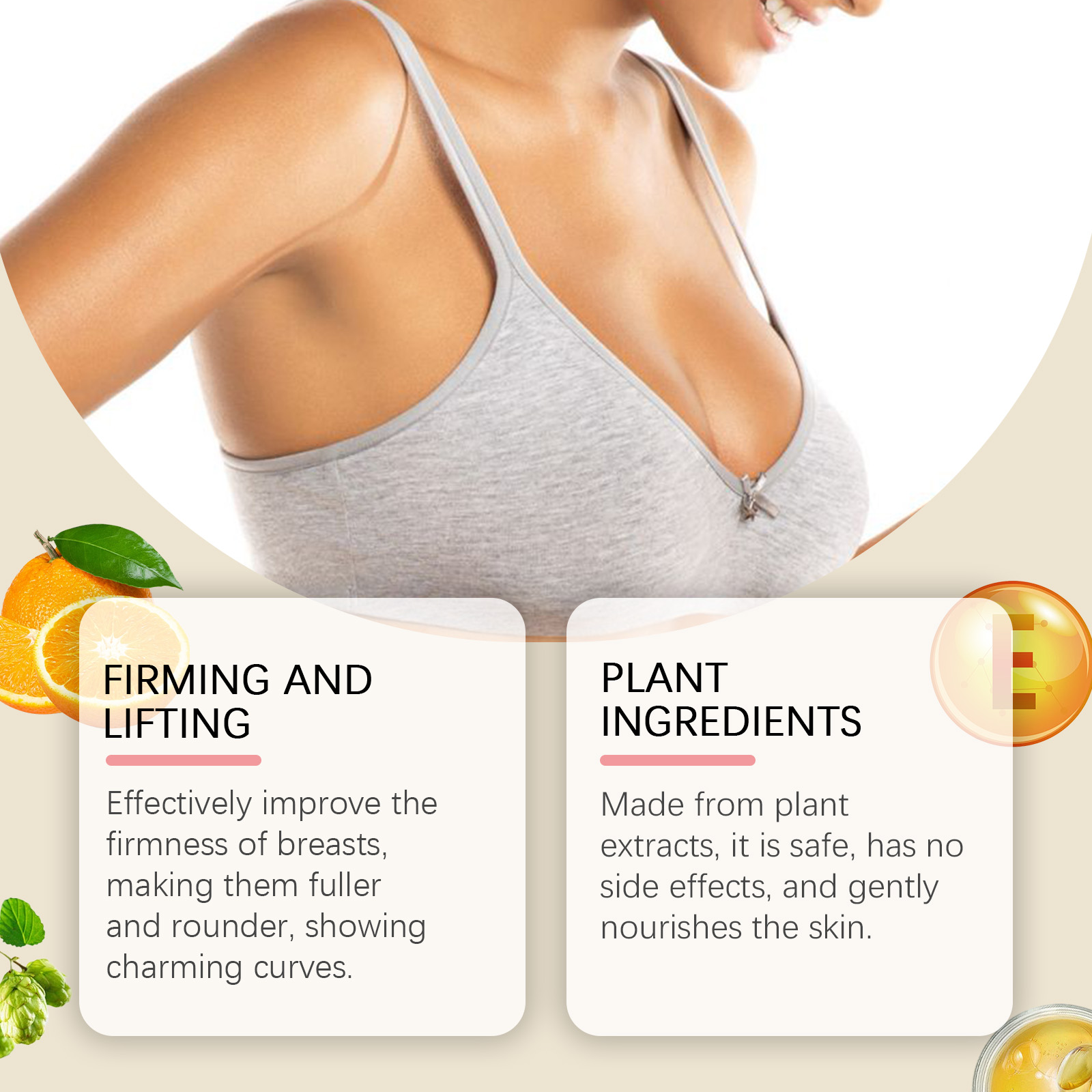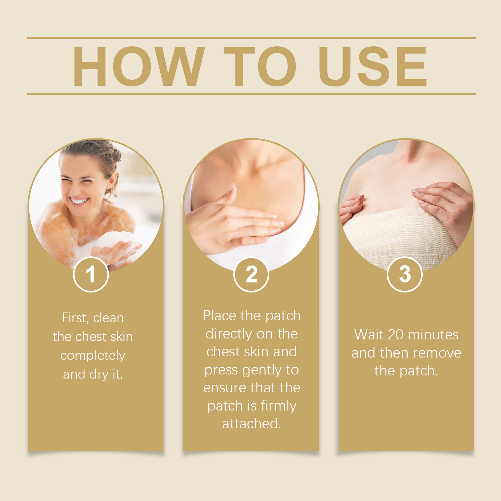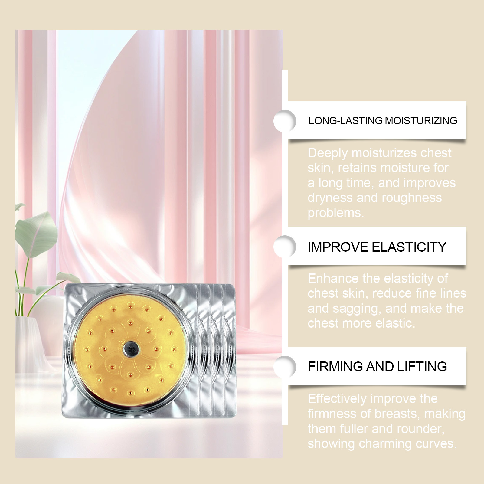 我们的胸部护理贴片含有酒花提取物、抗坏血酸(维生素C)、透明质酸。它可以有效提高乳房的紧致度,使乳房丰满圆润,展现迷人的曲线。它的使用方法很简单:1.首先,彻底清洗胸部皮肤并擦干。2.将贴片直接贴在胸部皮肤上,轻轻按压,确保贴片牢固附着。3.等待20分钟,然后取下贴片。帮助创造一个更丰满和更匀称的乳房。富含海葵精华,增强乳房大小和紧致度。