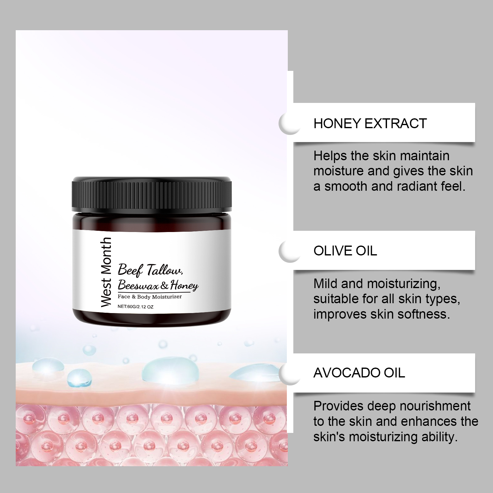 我们的油脂蜂蜜保湿霜含有蜡、牛脂、蜂蜜提取物。它可以帮助肌肤锁住水分,保持肌肤湿润,告别干燥。它的使用方法很简单:洁肤后,取适量面霜均匀涂抹于面部或身体肌肤,用手轻轻打圈按摩,使其被吸收。温和保湿,无论是干性还是油性皮肤都能感觉光滑护理。