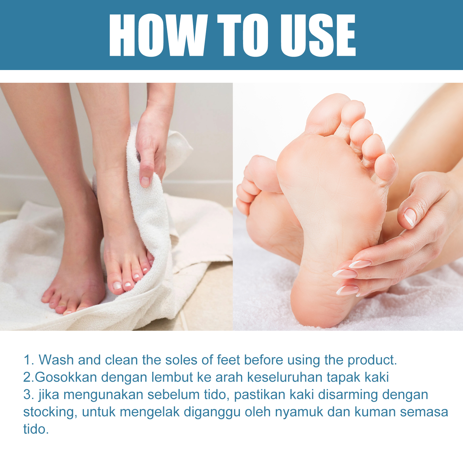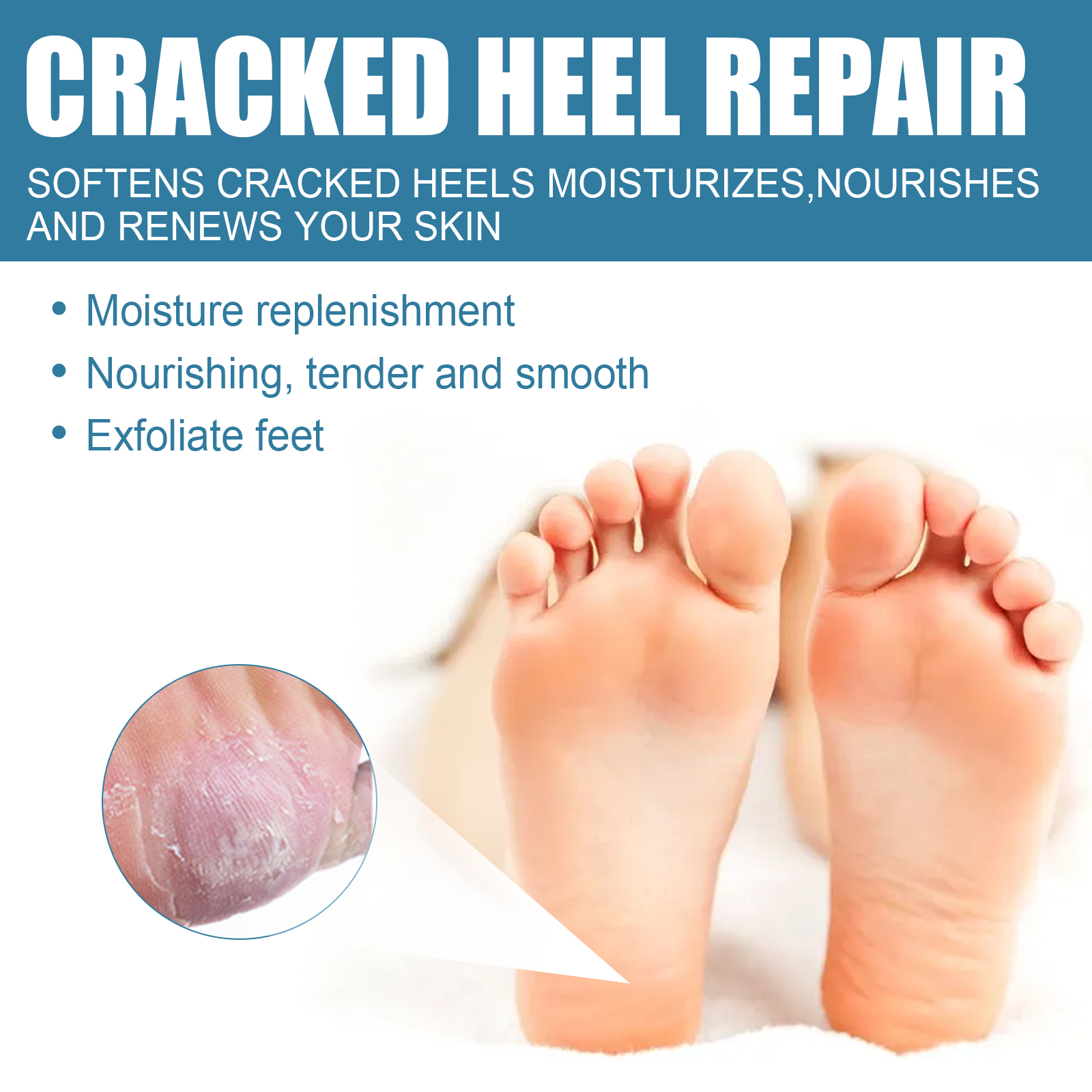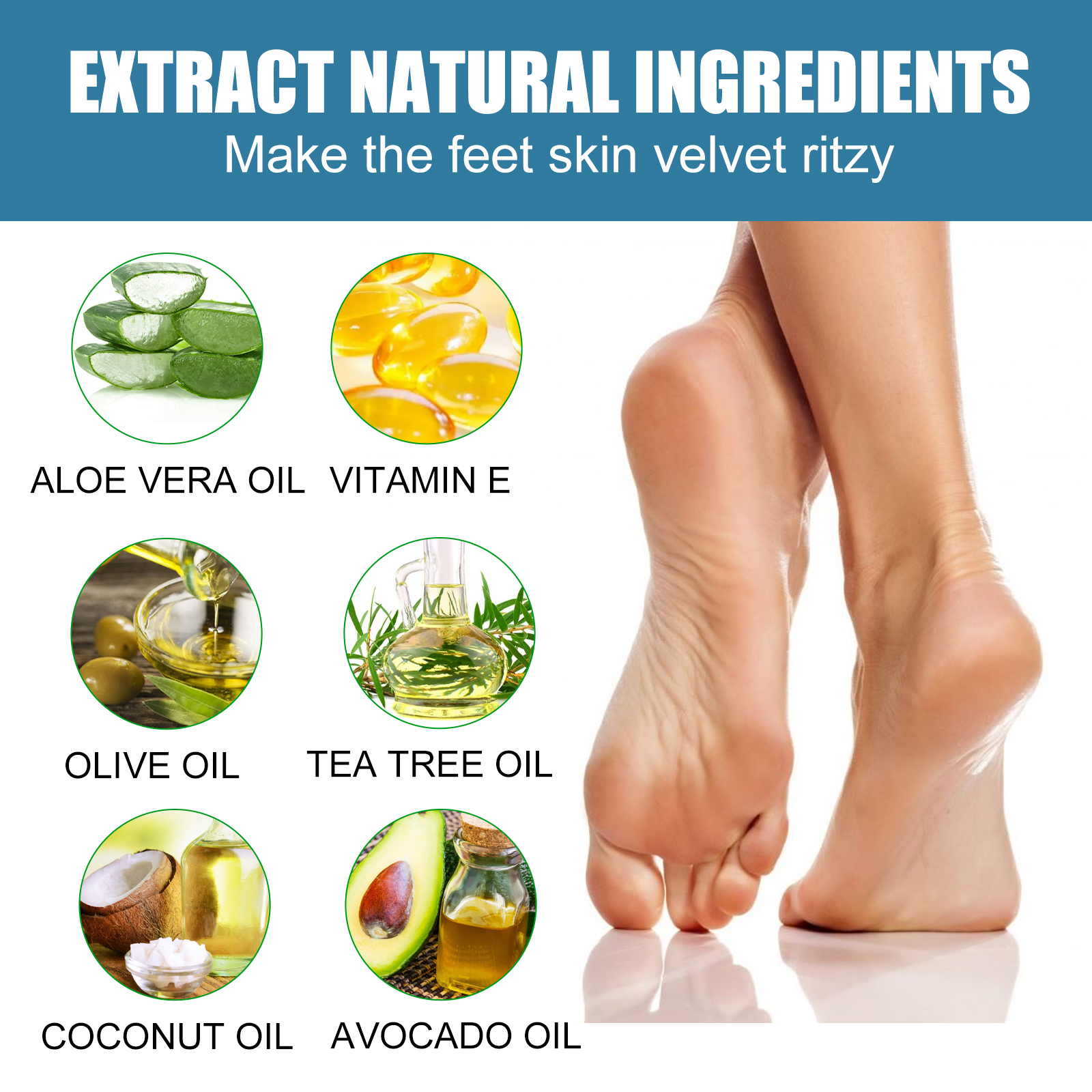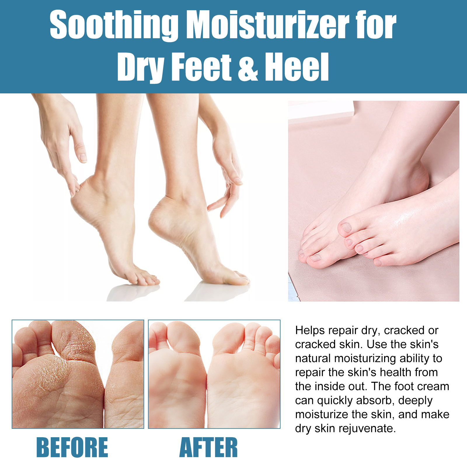 我们的足部干裂保湿霜含有维生素E、橄榄油、茶树油。它可以帮助修复干燥、龟裂的皮肤,由内而外修复肌肤的健康,深层滋润肌肤,使干燥的肌肤恢复活力。它的使用方法很简单:使用本产品前,请先洗净脚底,轻轻地揉搓整个脚底,使用之前请用袜子将腿部保护起来,避免在吸收期间被蚊子和细菌打扰。消除拉伸纹,帮助恢复脱落的皮肤,消除脂肪线,护理干裂脚跟,滋润保湿。