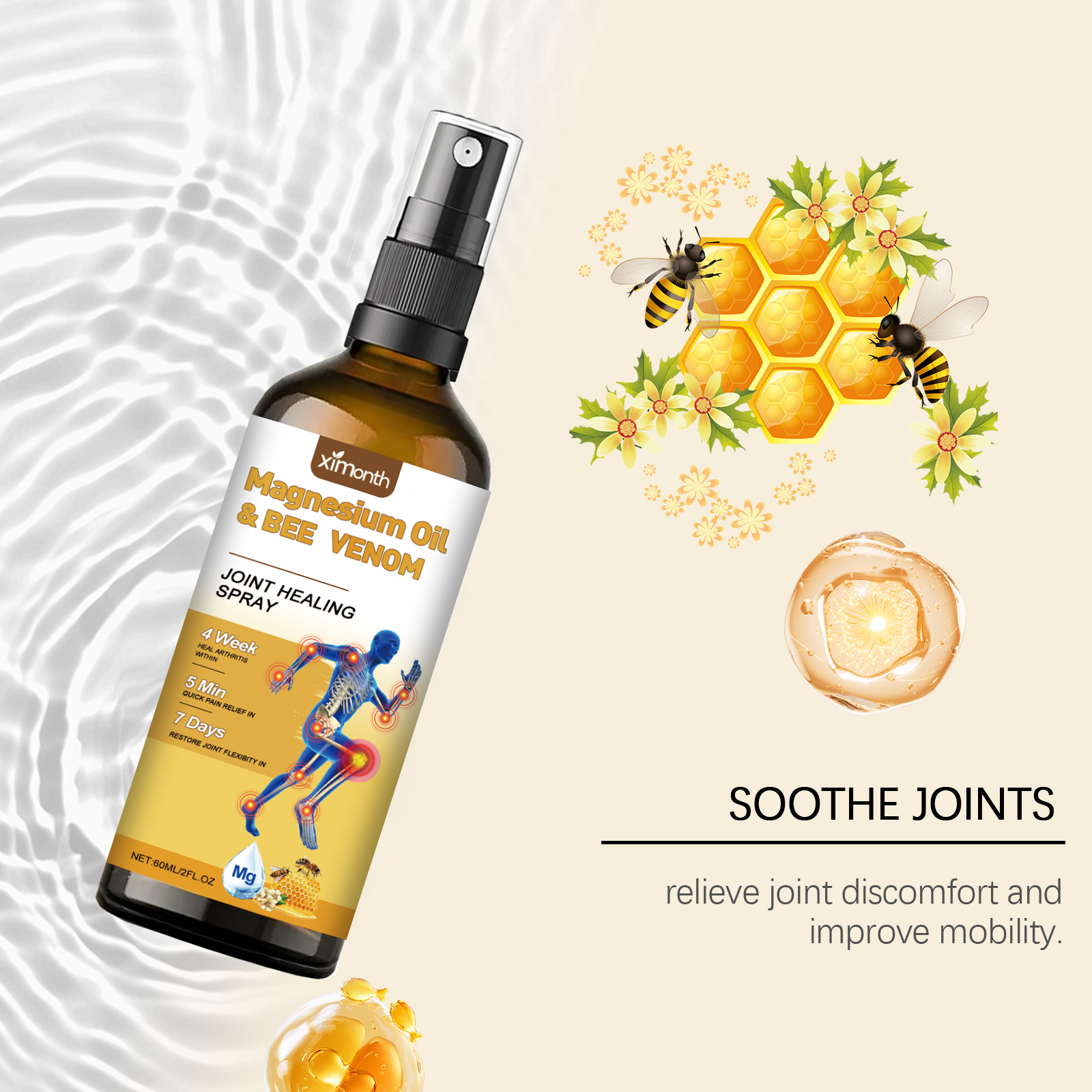 我们的蜂毒身体护理喷雾含有蜂毒、金缕梅。它可以深层滋养肌肤,改善关节的血液循环。易吸收,不油腻,带来愉悦的使用体验。它的使用方法很简单:清洁并干燥皮肤,在受影响的关节上喷酒适量本品。轻轻按摩至吸收。并且可以缓解关节炎疼痛;消除关节炎症;促进关节组织愈合;增强活动能力;改善血液循环;支持骨骼健康。