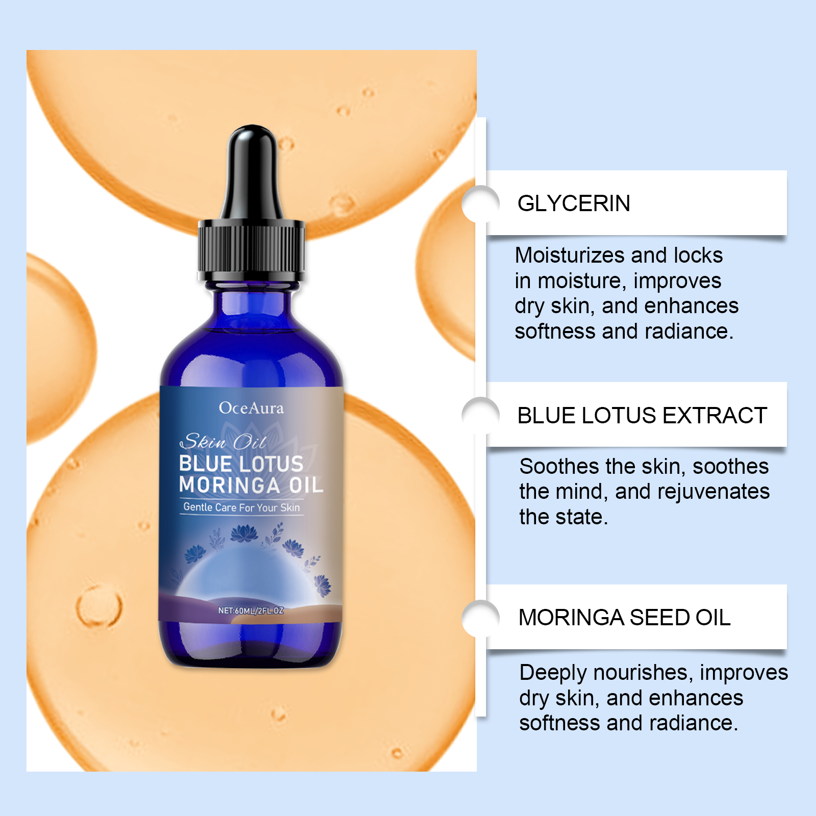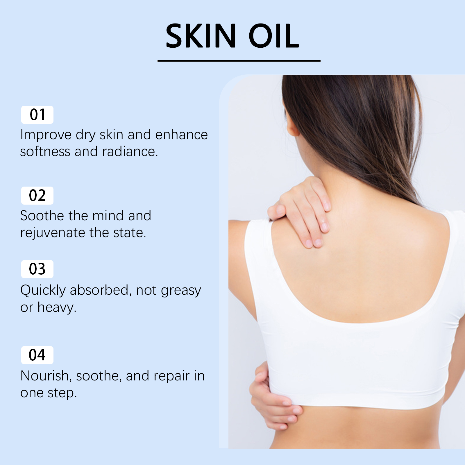 我们的滋养肌肤护理油含有蓝莲花提取物、辣木籽油。它可以改善皮肤干燥,增强柔软度和光泽度。它的使用方法很简单:清洁皮肤并保持干燥。将适量本品均匀涂抹于身体皮肤上。按摩至吸收。并且可以深层滋养,舒缓皮肤,安抚心灵,恢复状态。