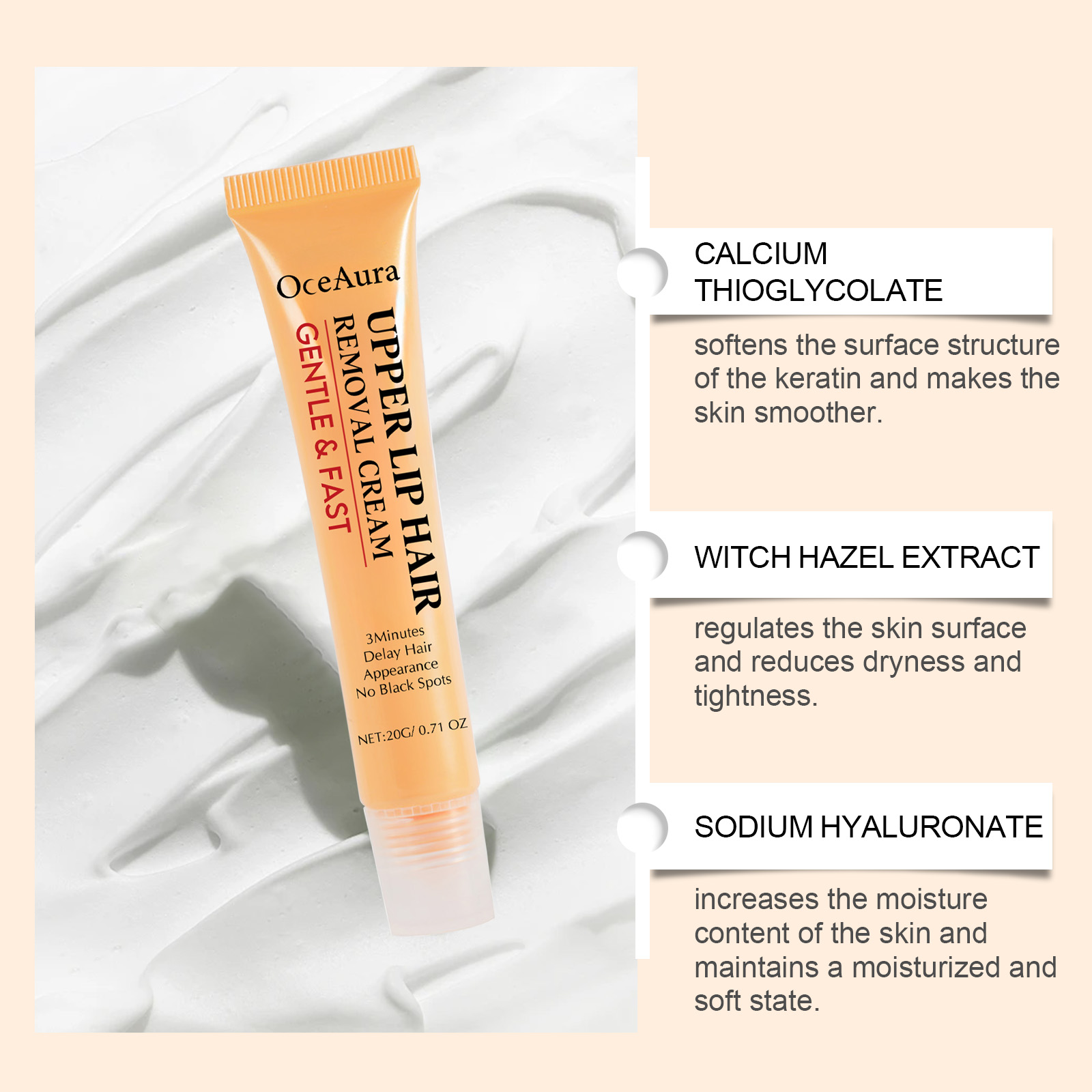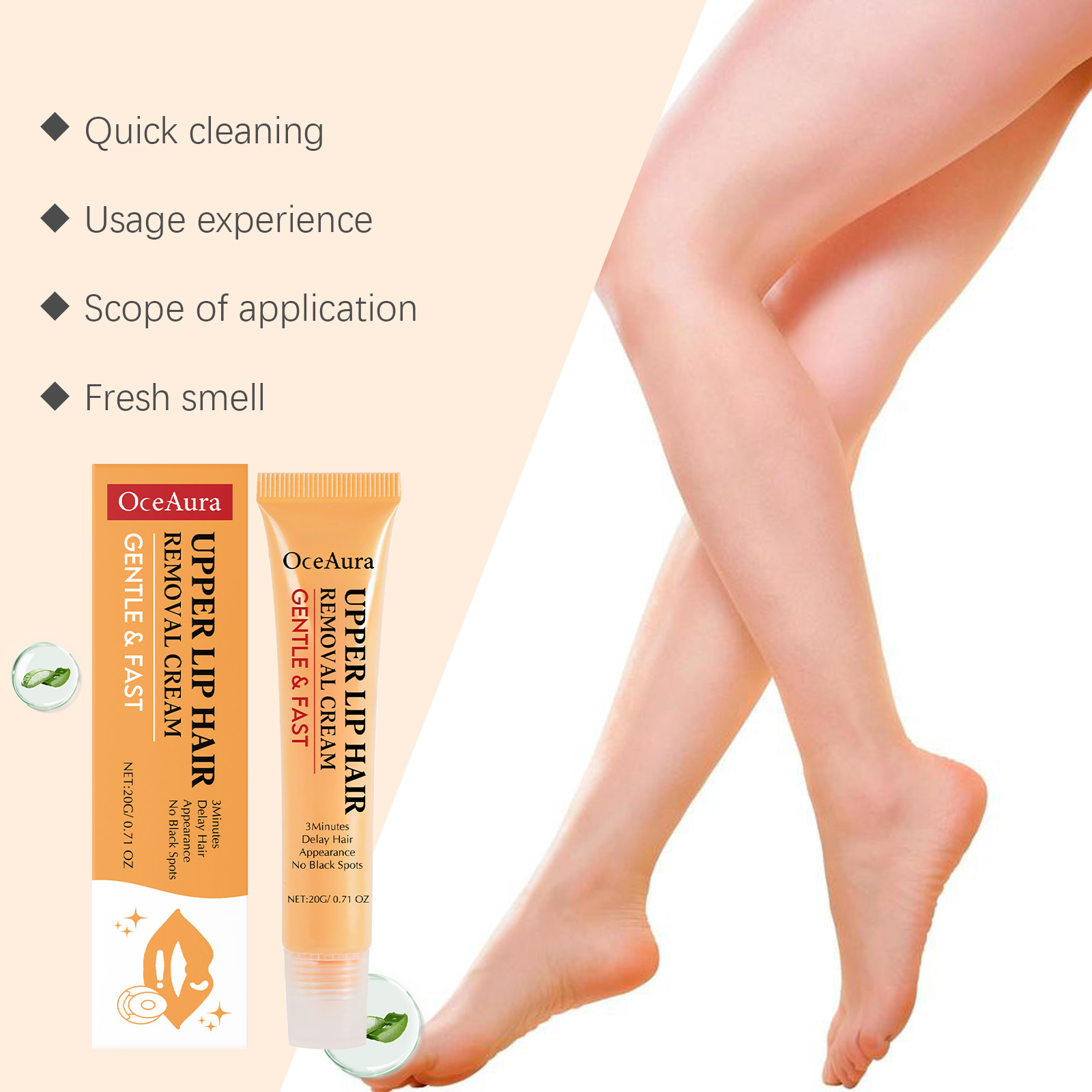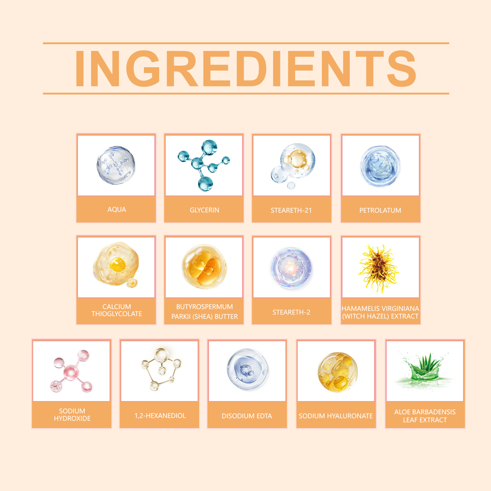我们的温和脱毛膏,由透明质酸钠、芦荟提取物精心调配而成。专为增加皮肤的含水量,并保持湿润和柔软的状态设计。使用方法极为便捷:清洁并干燥皮肤。将适量的脱毛霜均匀涂抹在需要脱毛的腿部、腋下、嘴唇和其他身体部位。等待3-5分钟后,逆着头发生长的方向擦拭头发,清洁脱毛区域的残留物。并且可以软化角质层的表面结构,使皮肤更光滑。